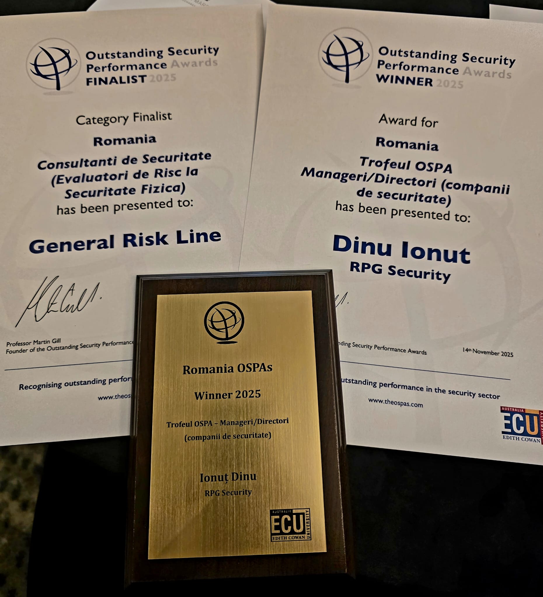 La ediția din 2025 a prestigioaselor Outstanding Security Performance Awards (OSPA România), General Risk Line s-a numărat printre finaliștii la categoria „Consultanți de securitate / Evaluatori de risc la securitate fizică”, o recunoaștere importantă a profesionalismului și calității serviciilor oferite.